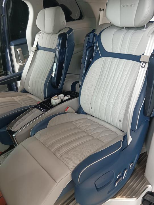 第二排中间还放了一套茶具,坐着这种空间大的车,忙碌完后还可以品上一杯热茶,简直不要太舒服。
